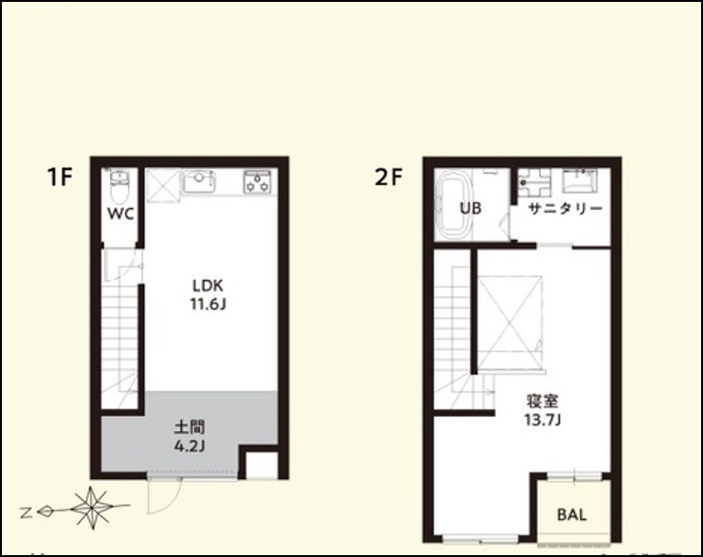 1階:LDK11.6帖、土間4.2帖/2階:洋室13.7帖